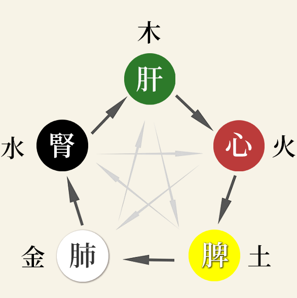 - 五行:木・火・土・金・水の5つの要素で自然や体を捉え、それぞれが助け合ったり抑え合ったりしながら働くことで体全体のバランスが整えられます。